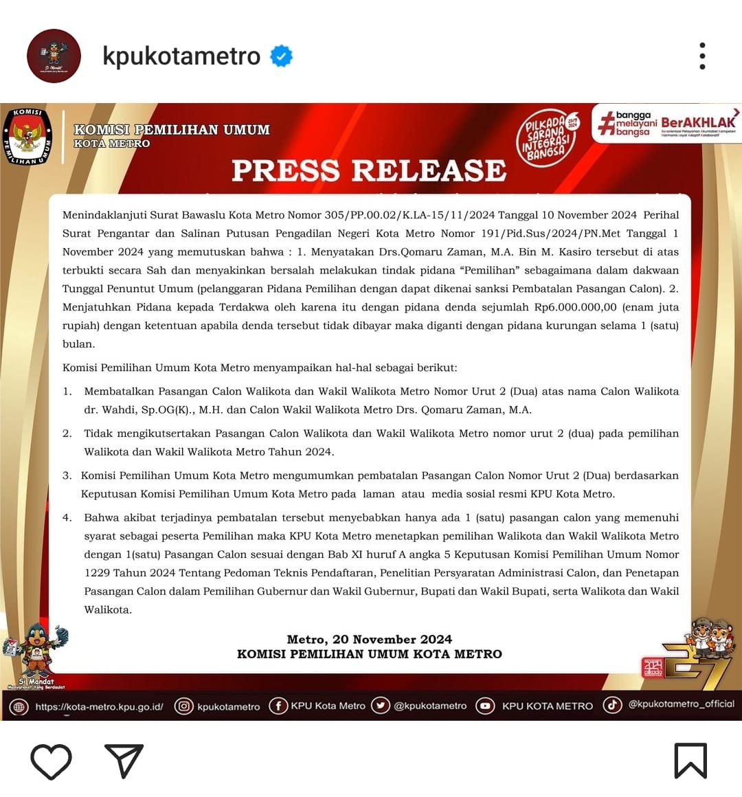 Pengumuman tersebut awalnya diunggah pada Rabu, 20 November 2024, sekitar pukul 11.30 WIB melalui akun media sosial resmi KPU Metro.