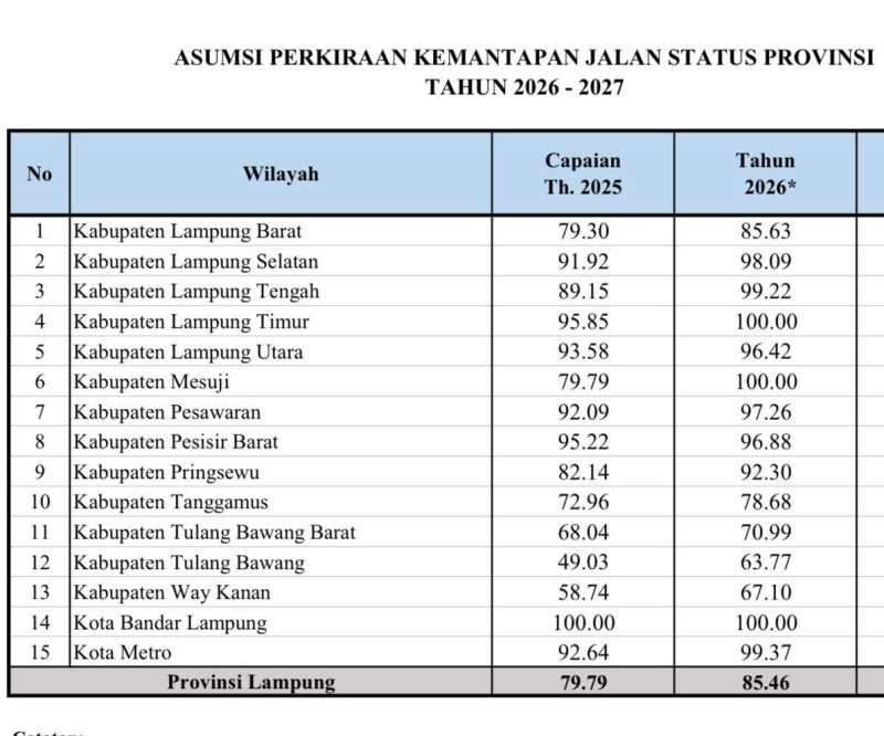 Fakta ini menegaskan bahwa beban utama pembangunan jalan provinsi berada di kabupaten, bukan kota. Di sisi lain, kota seperti Bandar Lampung yang telah mencapai 100 persen kemantapan cenderung stabil, menandakan ruang peningkatan terbesar memang berada di wilayah kabupaten yang memiliki jaringan jalan lebih panjang, kompleks, dan menantang secara geografis.