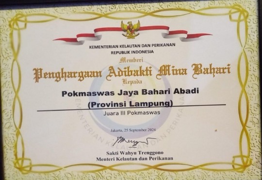 JAKARTA (berandalappung.com) -Kelompok Masyarakat Pengawas (Pokmaswas) Jaya Bahari Abadi dari Kuala Penet, Kabupaten Lampung Timur, berhasil meraih penghargaan bergengsi Adibakti Mina Bahari. Kelompok ini dinobatkan sebagai Pokmaswas terbaik ketiga dari total 3.150 Pokmaswas aktif di seluruh Indonesia.