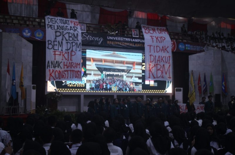 Spanduk itu bukan sembarang kritik. Tulisan besar terbentang: “Dekanat FKIP Pelanggar PKBM, BEM-DPM FKIP Anak Haram Konstitusi” dan “BEM-DPM FKIP Tidak Diakui KBM”. Aksi dilakukan saat BEM Keluarga Besar Mahasiswa (KBM) Unila naik panggung demo UKM.