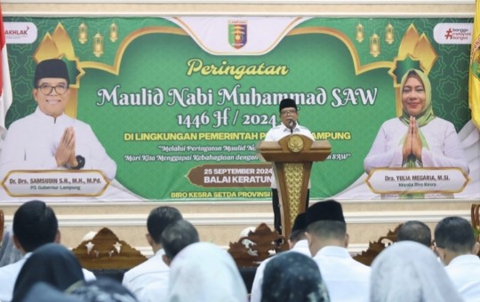 Bandar Lampung (berandalappung.com) – Pj. Gubernur Lampung Samsudin menghadiri Peringatan Maulid Nabi Muhammad S.A.W Tahun 2024 di Lingkungan Pemerintah Provinsi Lampung bertempat di Balai Keratun Lt. 3, Rabu (24/9/2024).