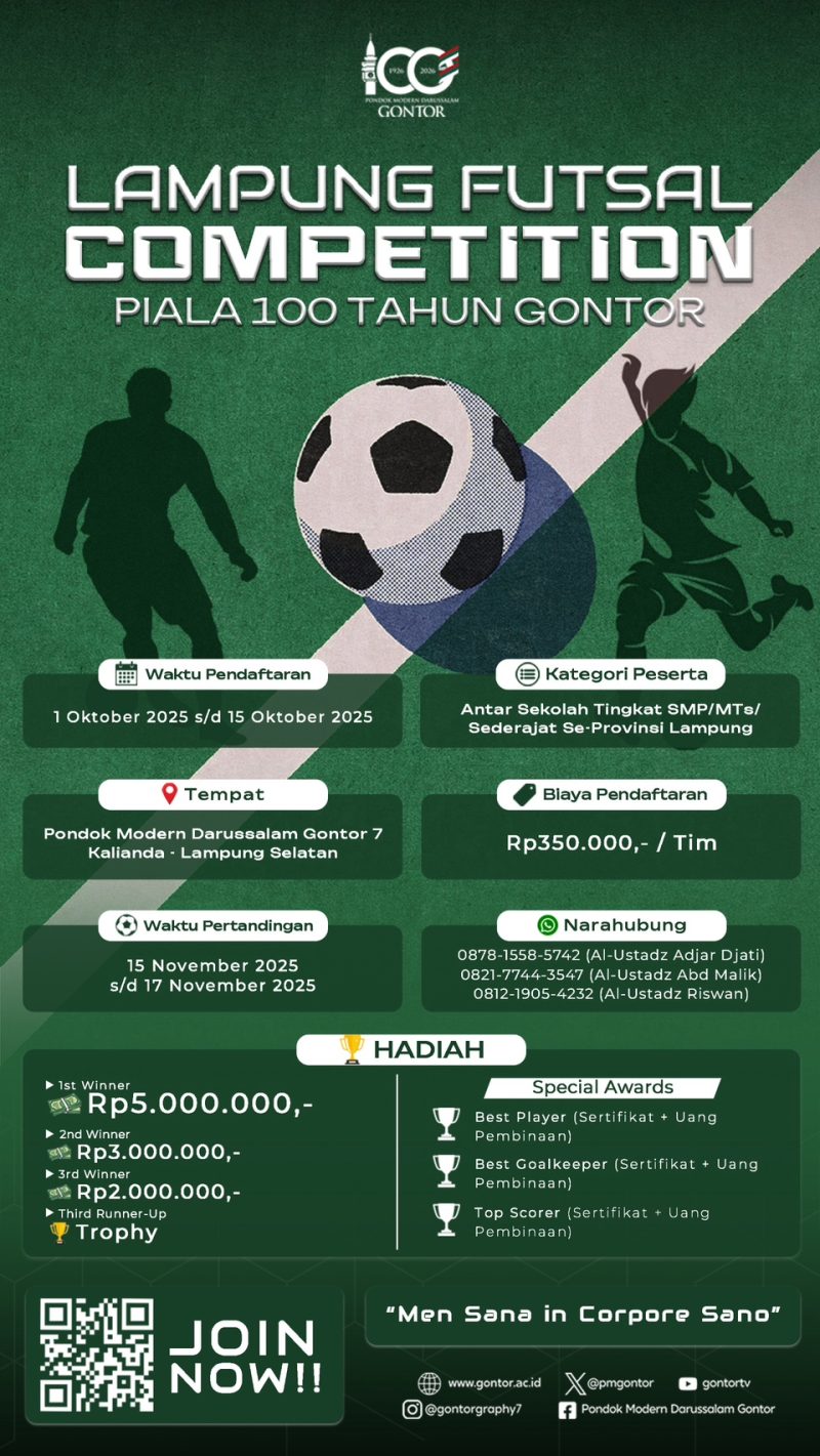 Kompetisi Futsal Ajang Lampung: Piala 100 Tahun Gontor resmi dibuka untuk tingkat SMP/MTs sederajat se-Provinsi Lampung.